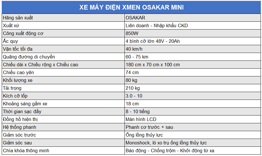 Xe máy điện XMEN OSAKAR MINI là một chiếc xe máy điện thể thao cỡ vừa giành riêng cho bạn. Rất phù hợp với các bạn học sinh cấp 2 và người có chiều cao dưới 1m70. Đặc biệt xe đi rất êm, tay ga rất mượt.
